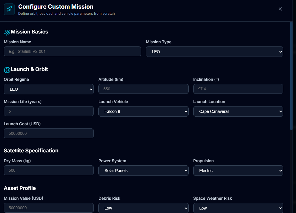 1️⃣ Mission Input Interface — Enter a satellite profile and select orbit/class.