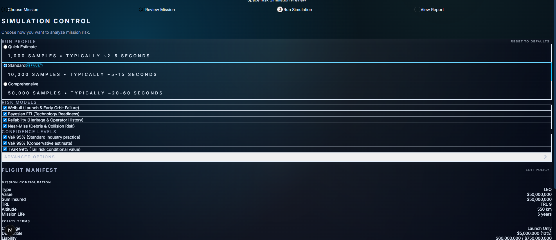 Mission → Risk Engine → Pricing Engine → Explainability → Exports/UI