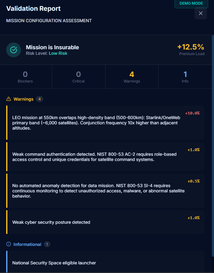 Example: A LEO constellation with a Chinese parent company triggers the Foreign Ownership Rule → AMBER flag → cites specific ITAR clause → adds 15% premium load.